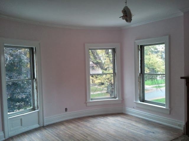 So as you can see, we have lots of chipped trim and dirty cream colored walls. I didn't get any snaps of the ceiling, drats! It wasn't pretty but that's all been taken care of now...